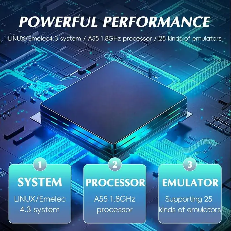 • Performance supérieure avec RK3566 + 4 Go RAM, assurant ainsi une expérience de jeu fluide et sans lag, même sur des jeux exigeants.