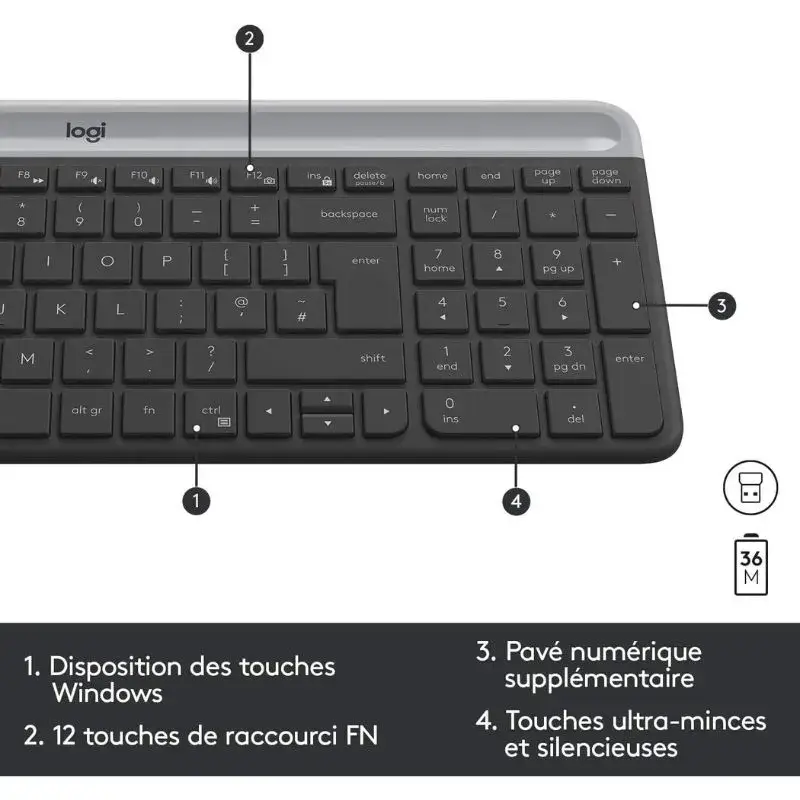 - Autonomie : Clavier jusquâĂ 36 mois, souris jusquâĂ 18 mois avec piles incluses