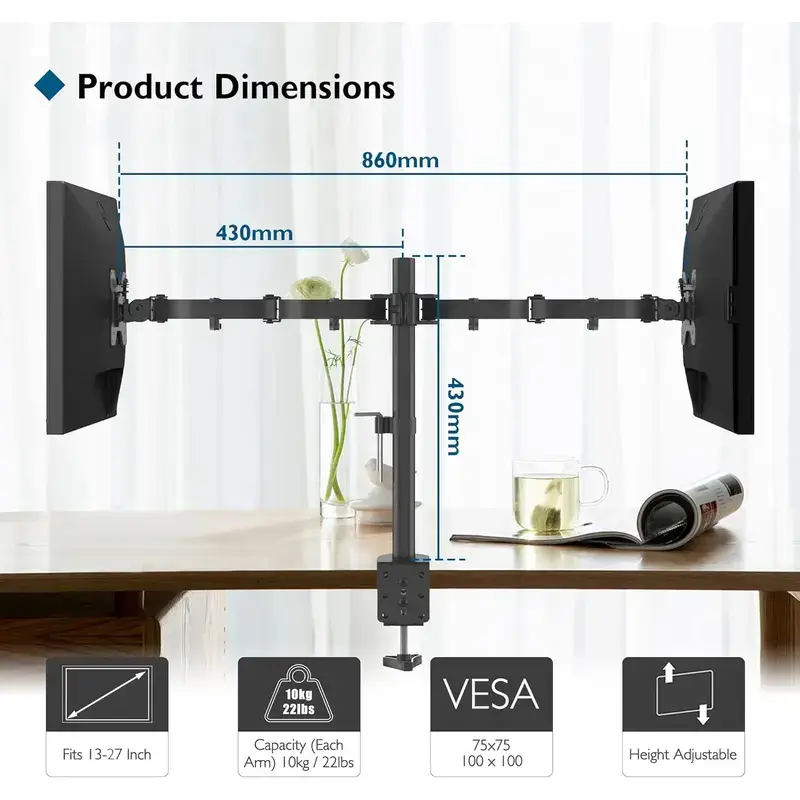 - Il permet d’installer deux moniteurs côte à côte avec une flexibilité maximale pour chaque écran.